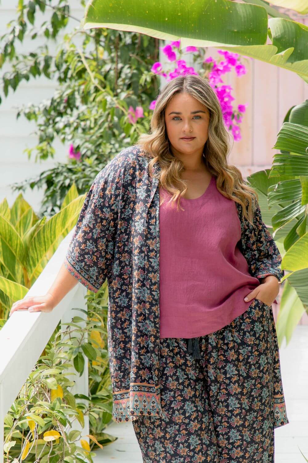For the photo shoot and displaying the open styling of the kimono jacket, we sized Kate down to the ML. Ordinarily, she would take the Plus Size in this design ensuring plenty of wrap width around the hips should she wish it to be worn as a robe or closed jacket utilising the matching belt.