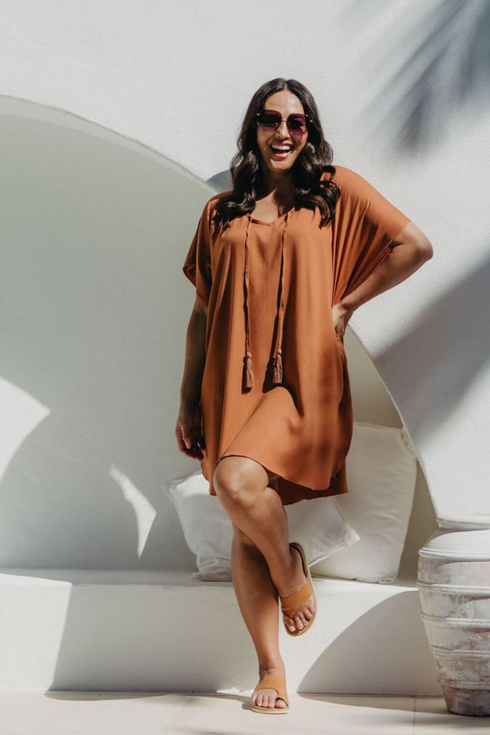 Side view of the Mocha Mousse short kaftan dress on a size S/M model, showing kimono sleeve drape and fluid silhouette