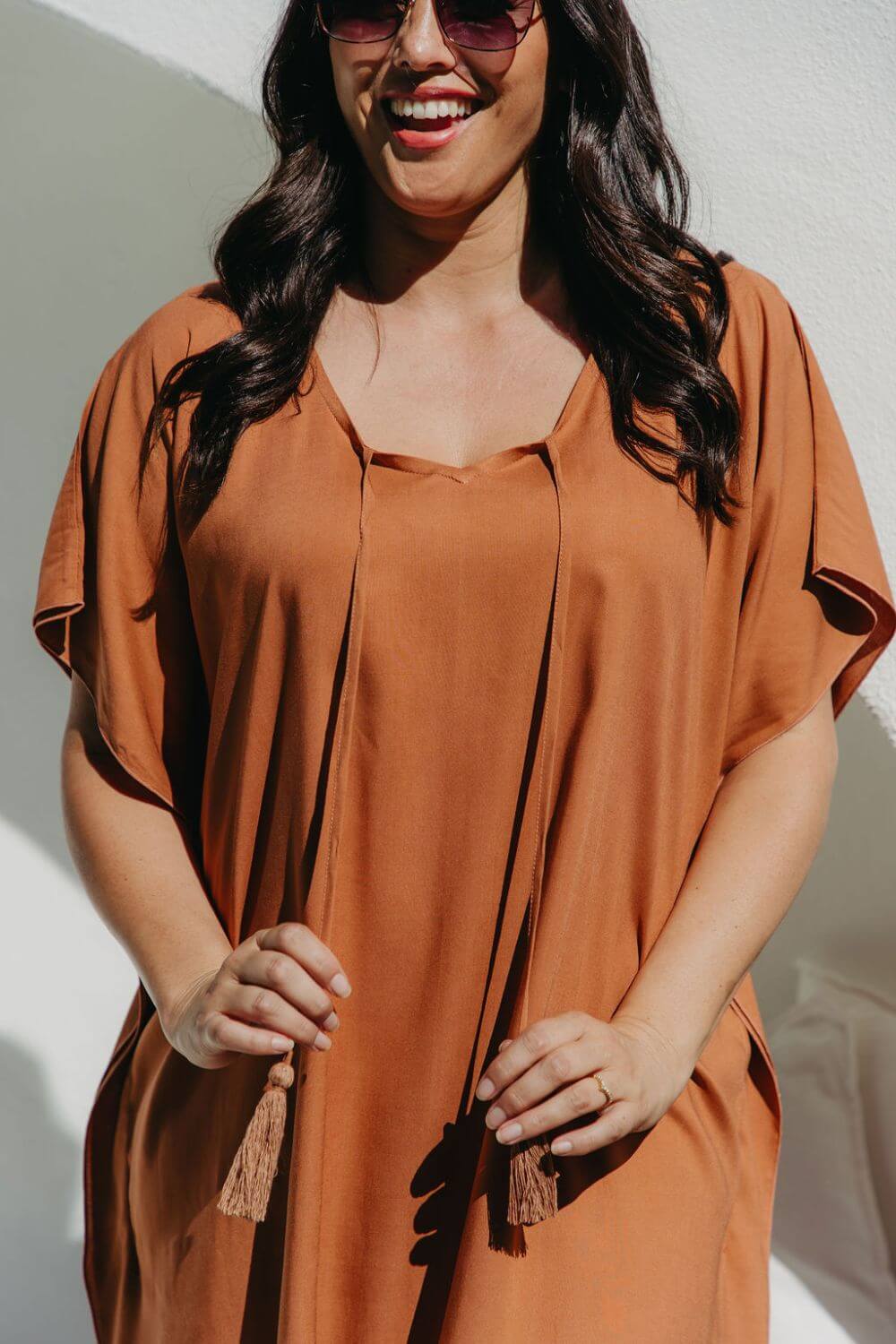 Close-up of the Mocha Mousse short kaftan dress showing the soft V-neckline and hand-made cotton tassels