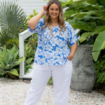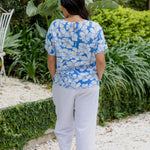 Crafted from soft yet structured rayon, the Arianna Blouse drapes beautifully while holding its shape. The mid-length hemline offers styling versatility — wear it out for ease or tuck in for a sleeker silhouette. Faux sleeve cuffs give a tailored finish without the ironing, while the flattering V-neckline and back yoke panel add shape and polish. Finished in our exclusive Arianna floral print — a tropical mix of hibiscus blooms in ocean blues and white — this blouse captures the essence of laid-back resort style.