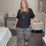 Genießen Sie mühelosen Stil mit unserer Hose mit weitem Bein und super bequemer, entspannter Passform. Unser charakteristischer Leopardenprint passt perfekt zu unserem klassischen schwarzen Blusentop.