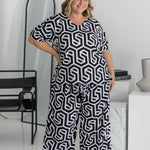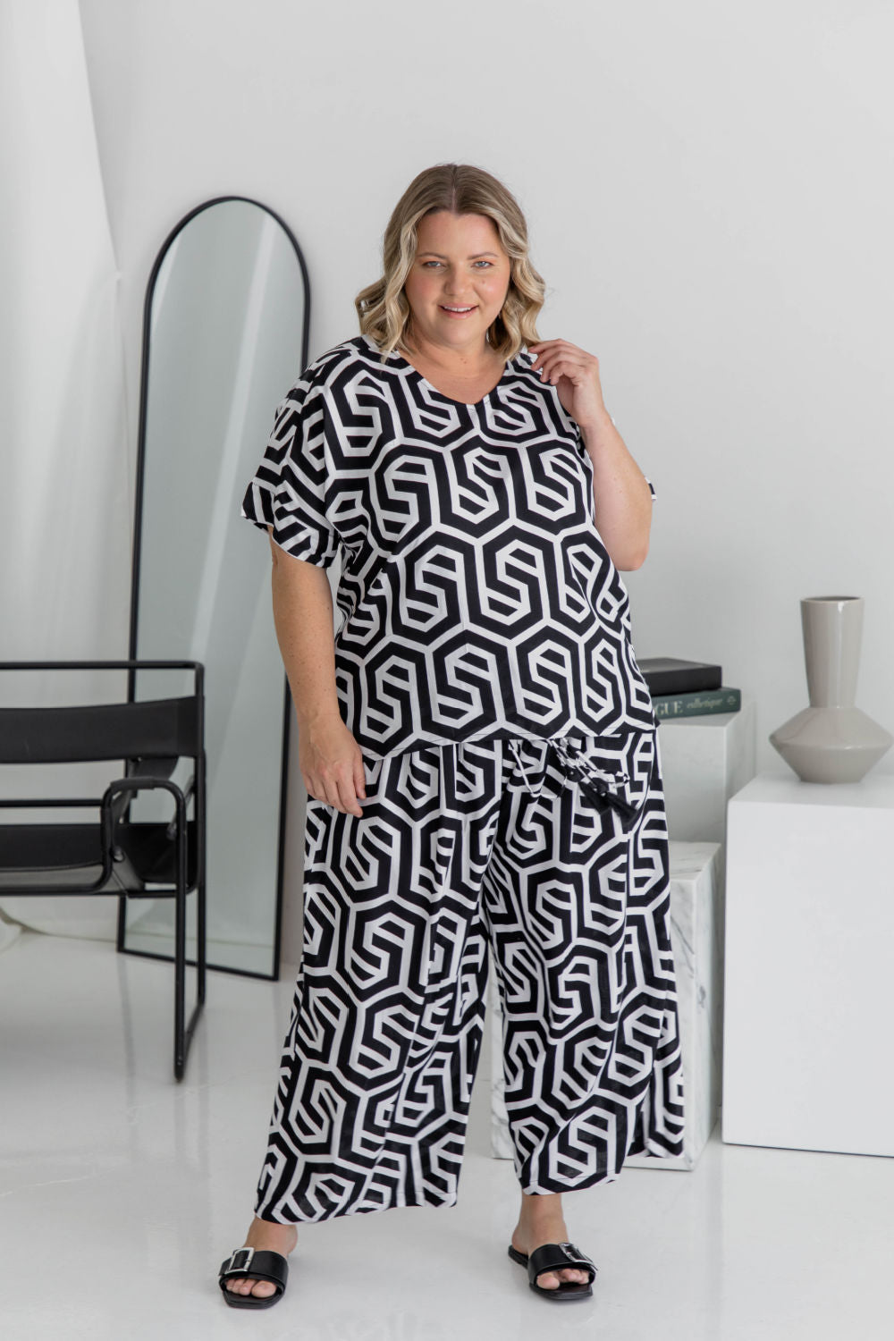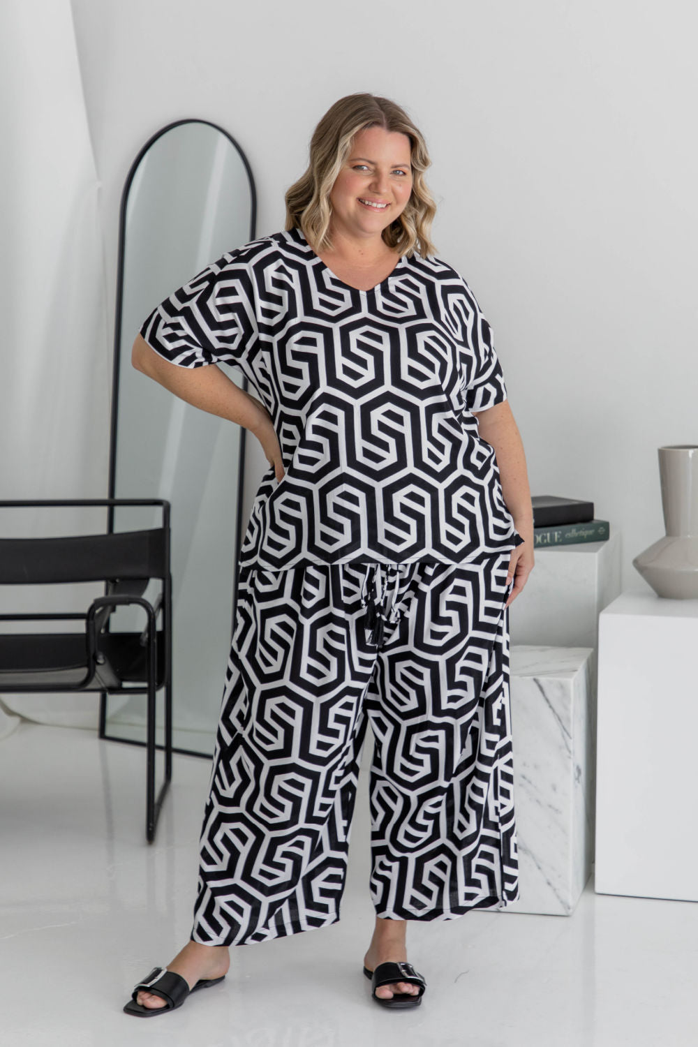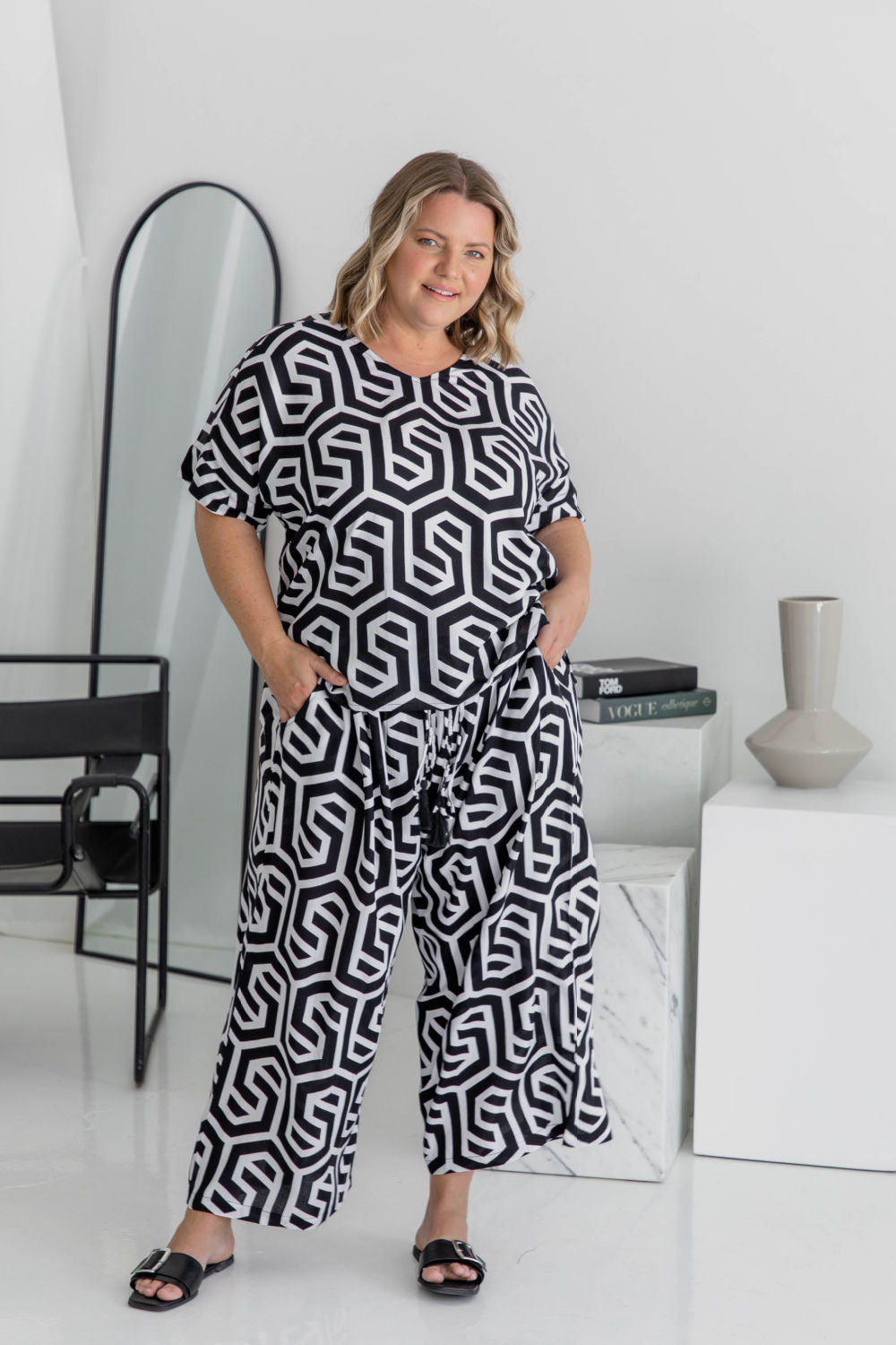 woman in Bali villa wearing outfit set of palazzo pants and top in black and white geometric print