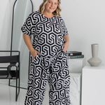 Veredeln Sie Ihren Stil mit unserem schwarz-weißen Set mit geometrischem Muster. Es besteht aus einer wunderschön abgestimmten Bluse und einer Hose mit weitem Bein. Diese schicke Kombination bietet eine fließende Silhouette und einen bequemen und dennoch eleganten Look – perfekt für jeden Anlass.