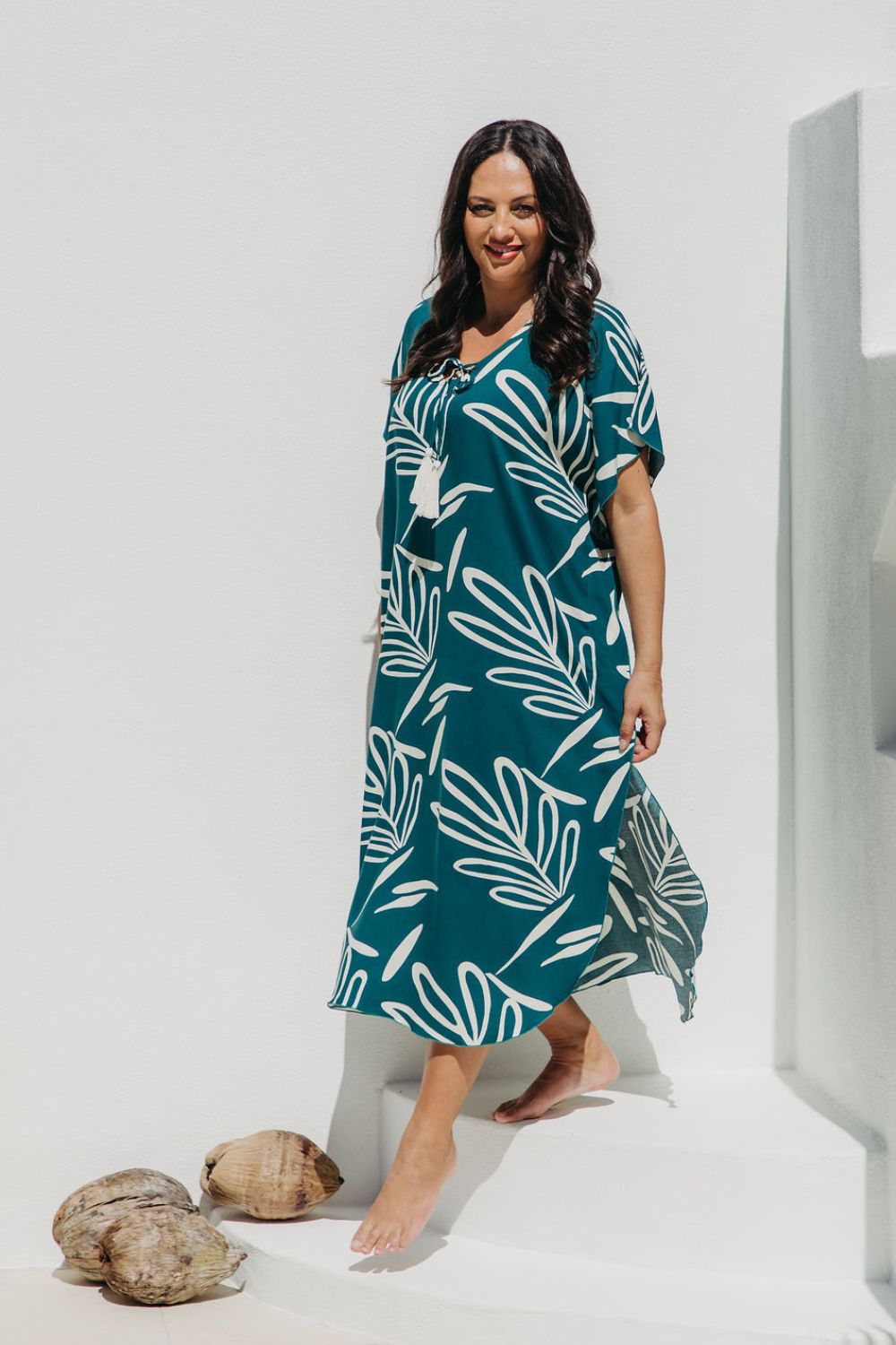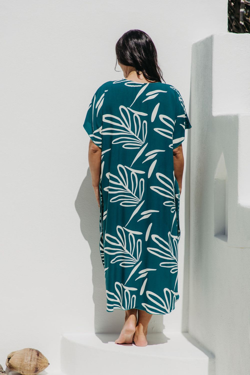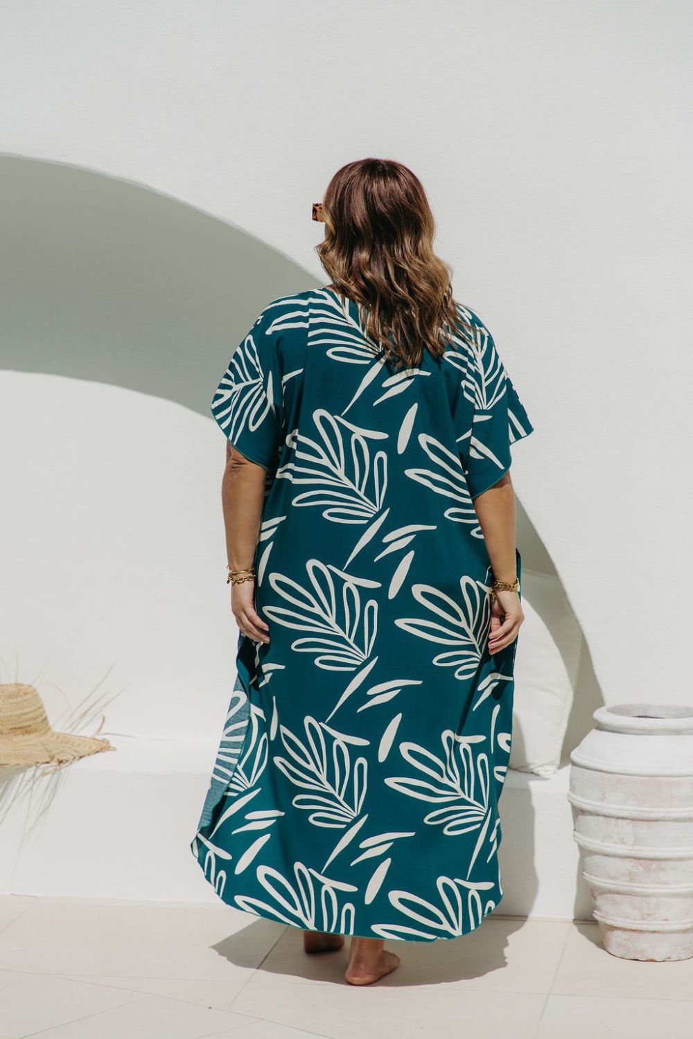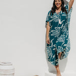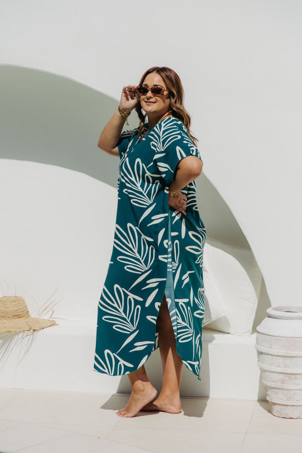 Bring effortless elegance to your summer wardrobe with our Long Kaftan in deep mineral green, featuring a bold natural white leaf design. The rich green backdrop highlights the striking leaf motif, creating a modern, graphic look that’s still relaxed and easy to wear.
