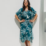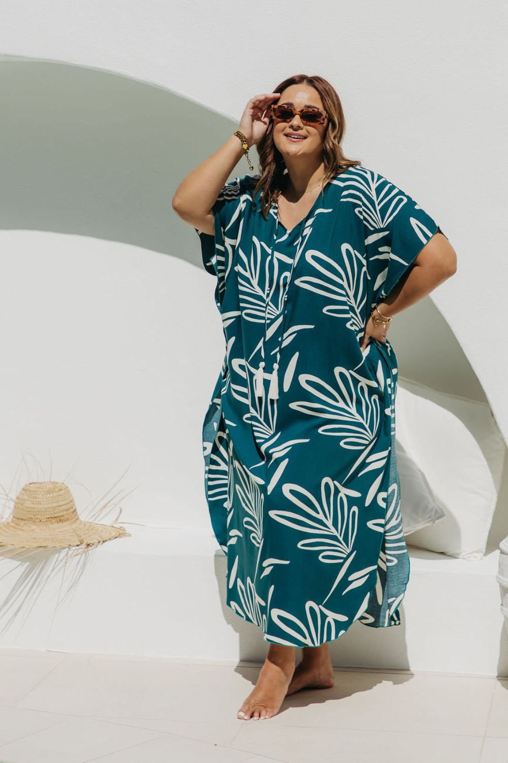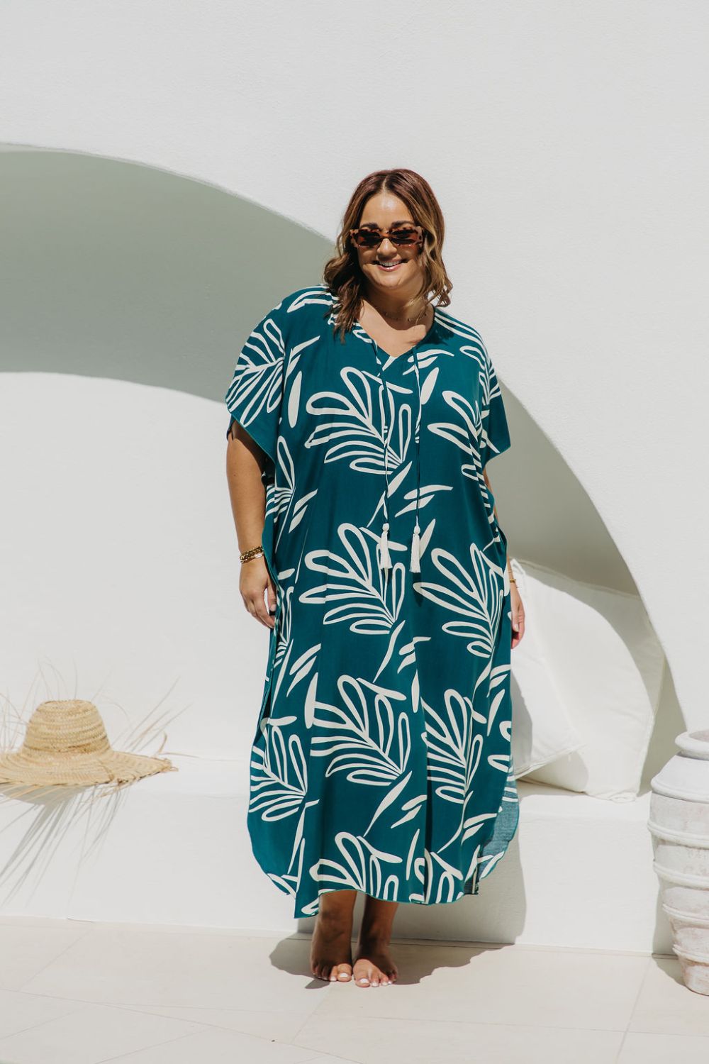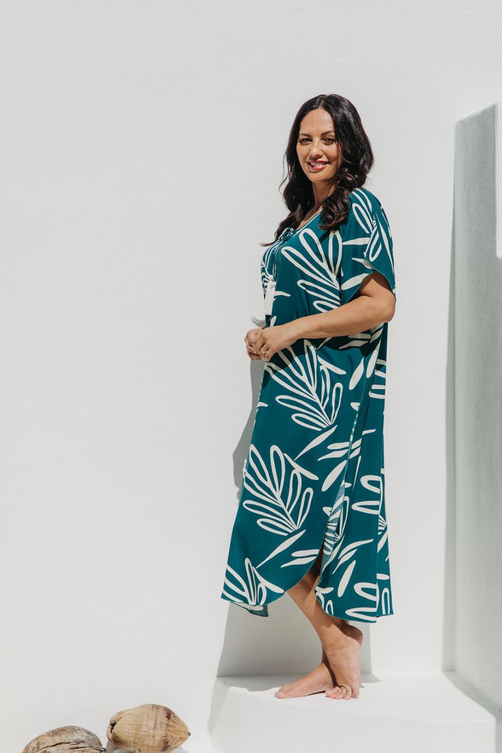 Bring effortless elegance to your summer wardrobe with our Long Kaftan in deep mineral green, featuring a bold natural white leaf design. The rich green backdrop highlights the striking leaf motif, creating a modern, graphic look that’s still relaxed and easy to wear.