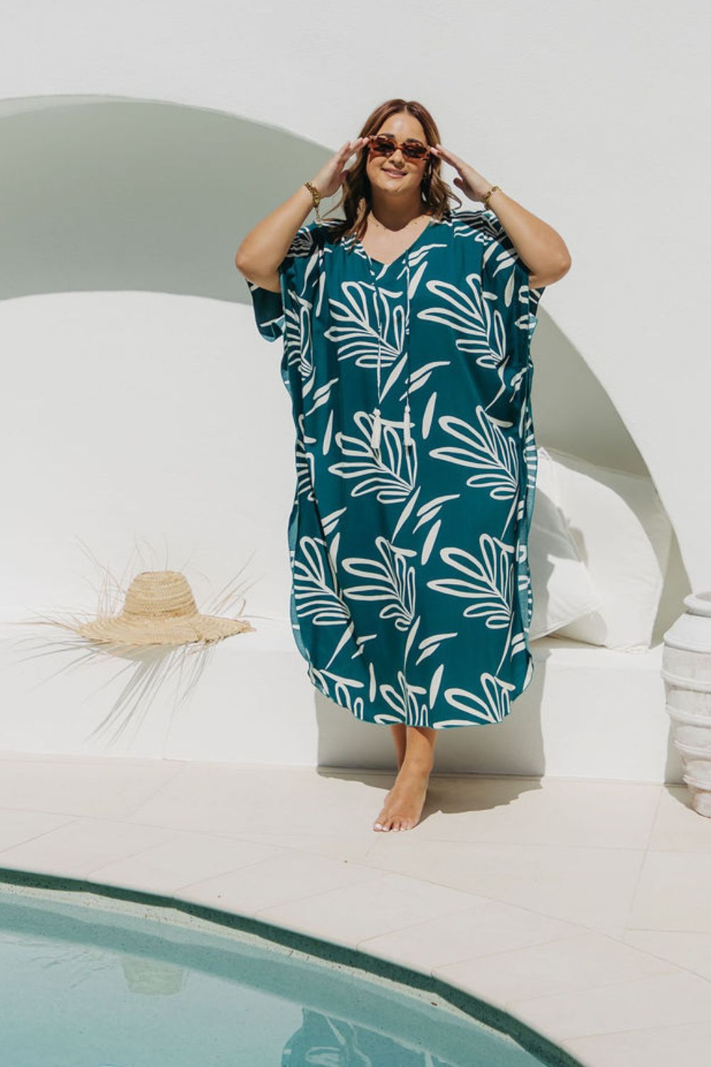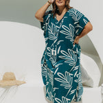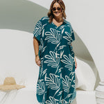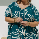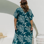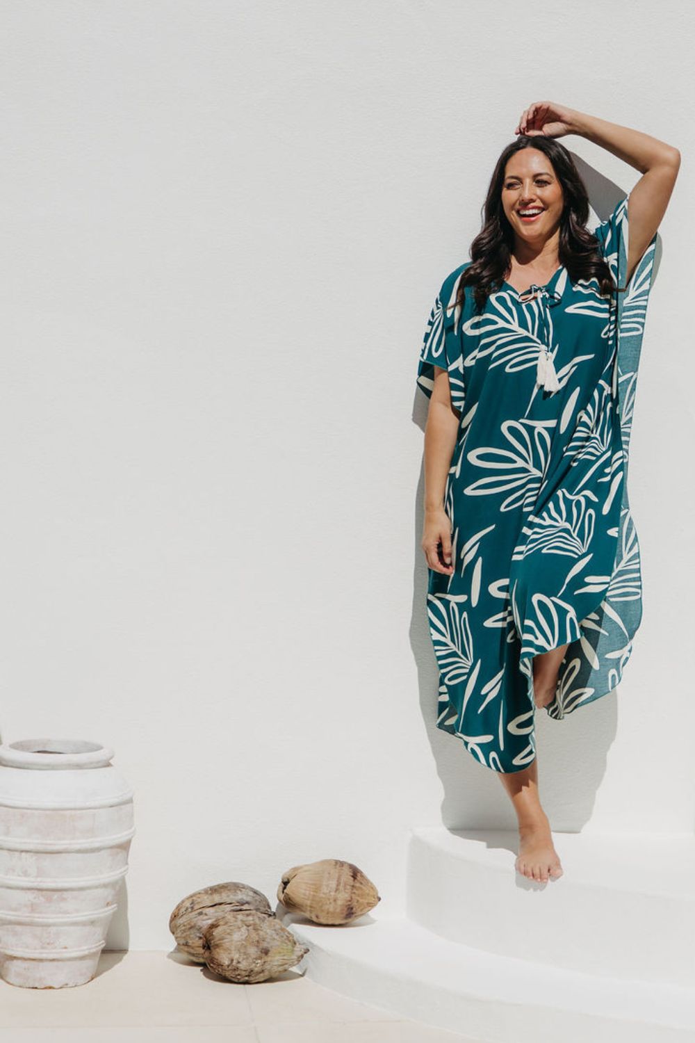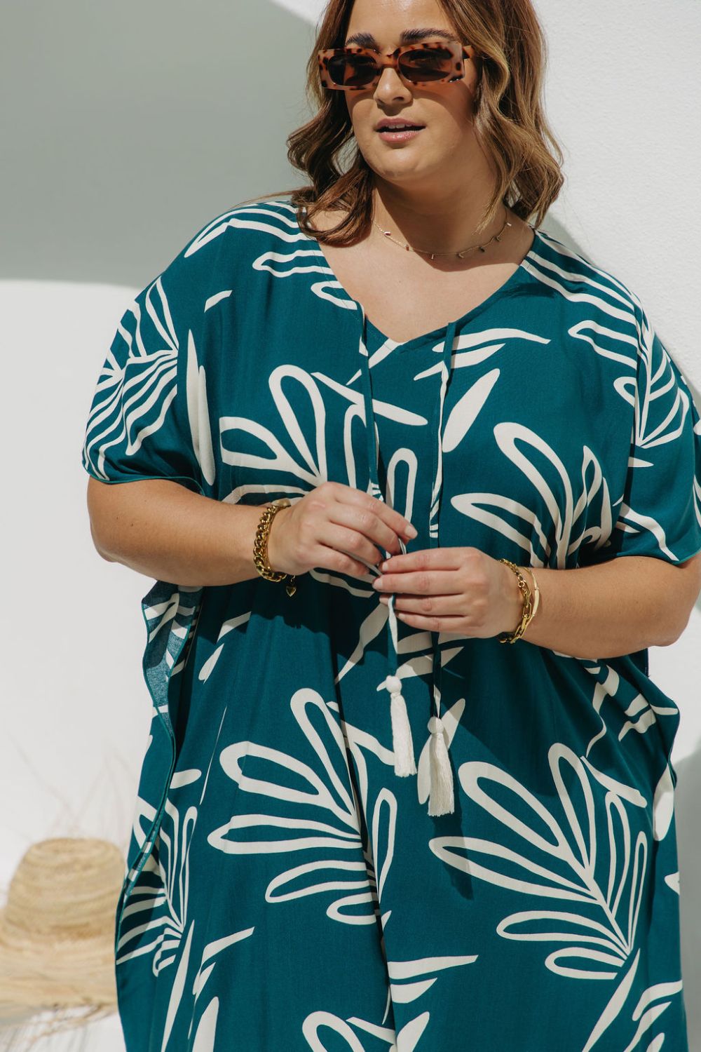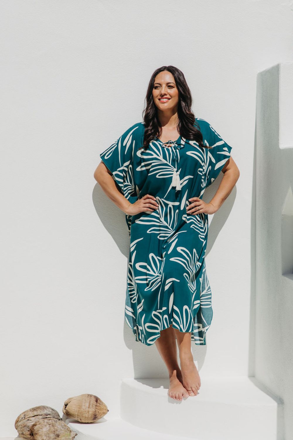 Bring effortless elegance to your summer wardrobe with our Long Kaftan in deep mineral green, featuring a bold natural white leaf design. The rich green backdrop highlights the striking leaf motif, creating a modern, graphic look that’s still relaxed and easy to wear.