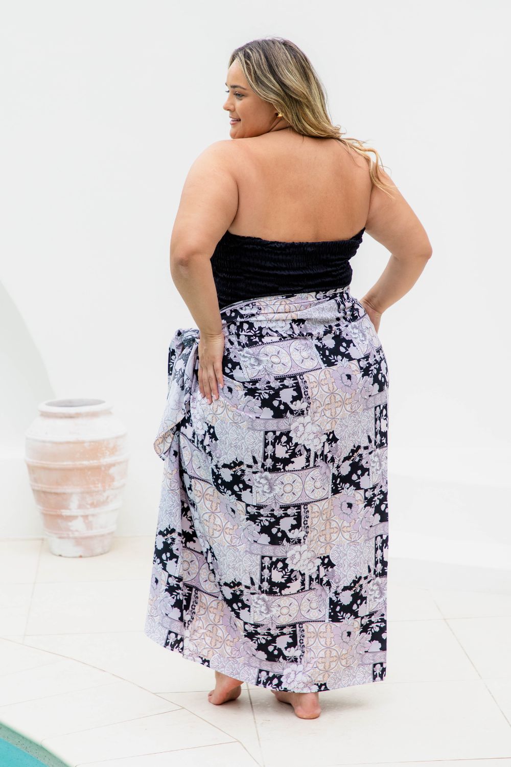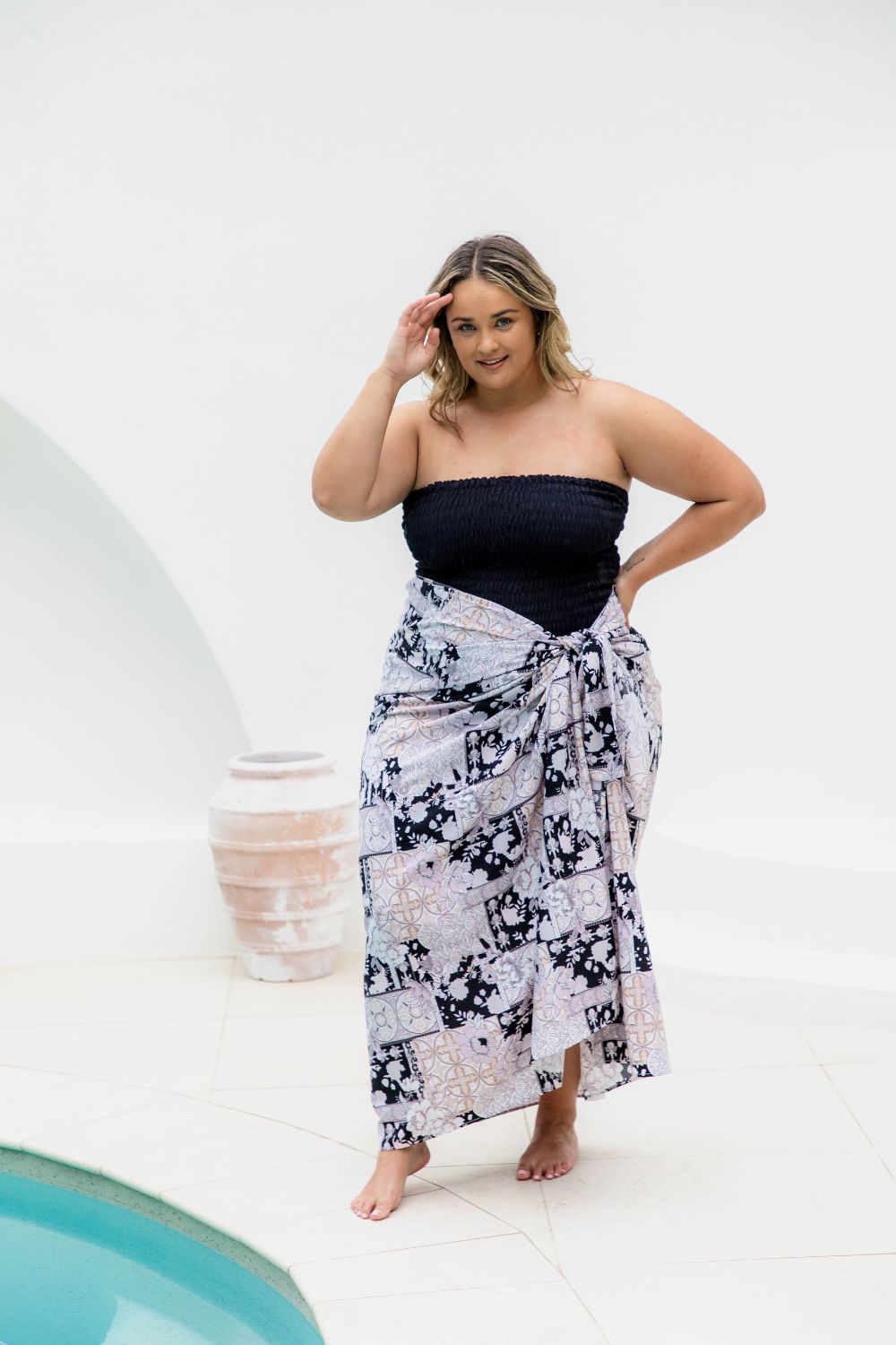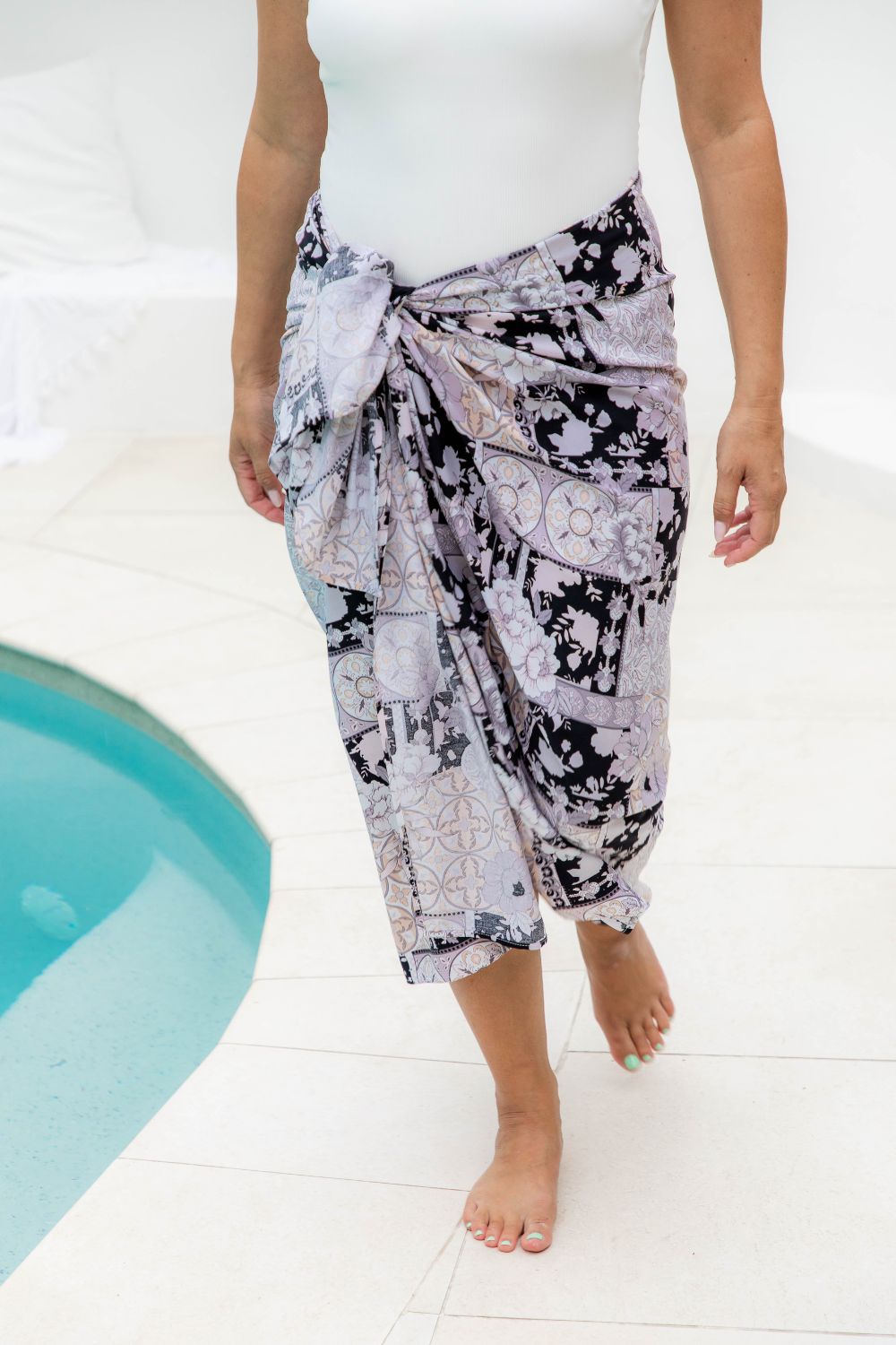 This unique print is a true work of art – a patchwork-style combination of florals, mandalas, geometrics, and leaves, harmonised into a soft yet striking palette of black, peach, white, pink, mauve, and grey. The result? A versatile sarong that pairs beautifully with swimwear or can be styled as a skirt, wrap, or even a light shawl.