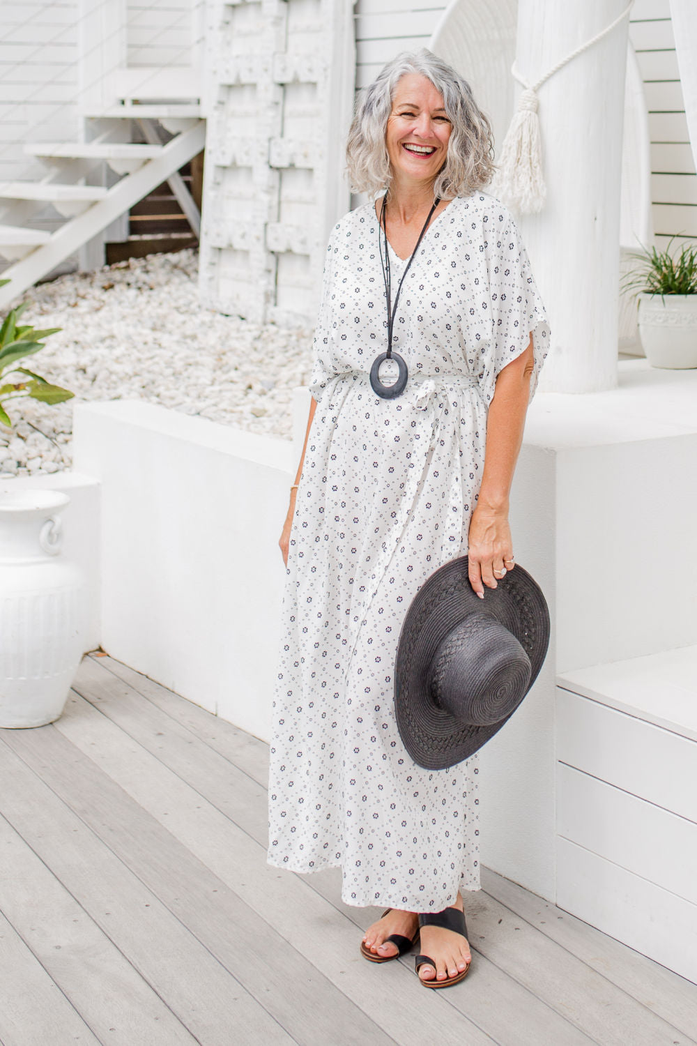 Lee, unser hübsches silbernes Model, trägt ebenfalls Größe ML. Normalerweise trägt Lee Größe 10, aber der Stoff fällt wunderschön und sorgt für ein luftig-kühles Tragegefühl an tropischen Tagen. Zum Längenvergleich: Lee ist 168 cm groß.