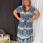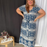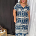 Erfreuen Sie sich an diesem wunderschönen geometrischen Muster unseres beliebten langen Sommerkleides. Das atemberaubende Design in Blau und Weiß und die kunstvollen Details sorgen für einen wunderschönen, schicken Sommerlook.