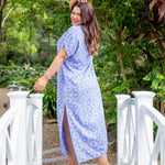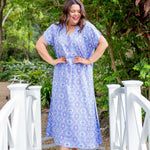 We've blended soft blues, mauves, purples, peach and white to create this sensational long summer dress.