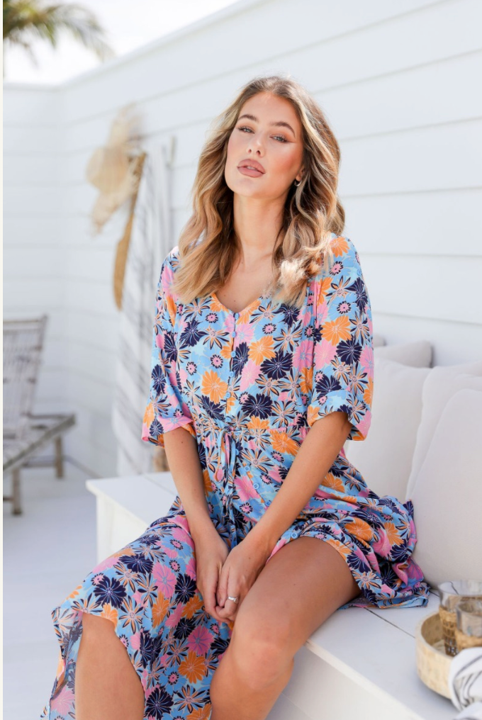 You'll find the floral print is a beautiful blend of blues, pinks and soft orange. A bed of bliss to drape yourself in.