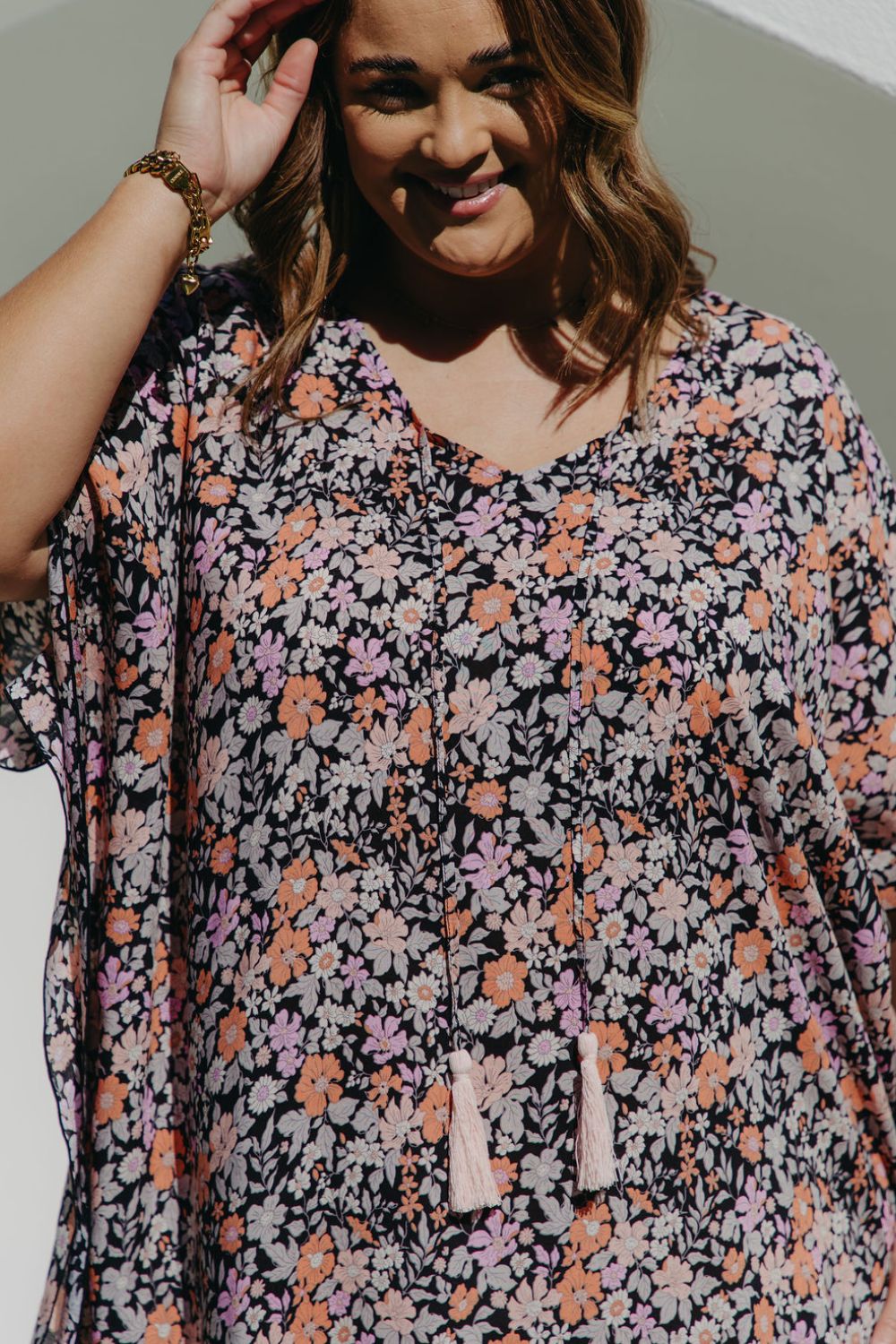 Featuring a delicate peach, pink, and grey floral print on a classic black base, this piece adds just the right pop of colour to your resort wear wardrobe.