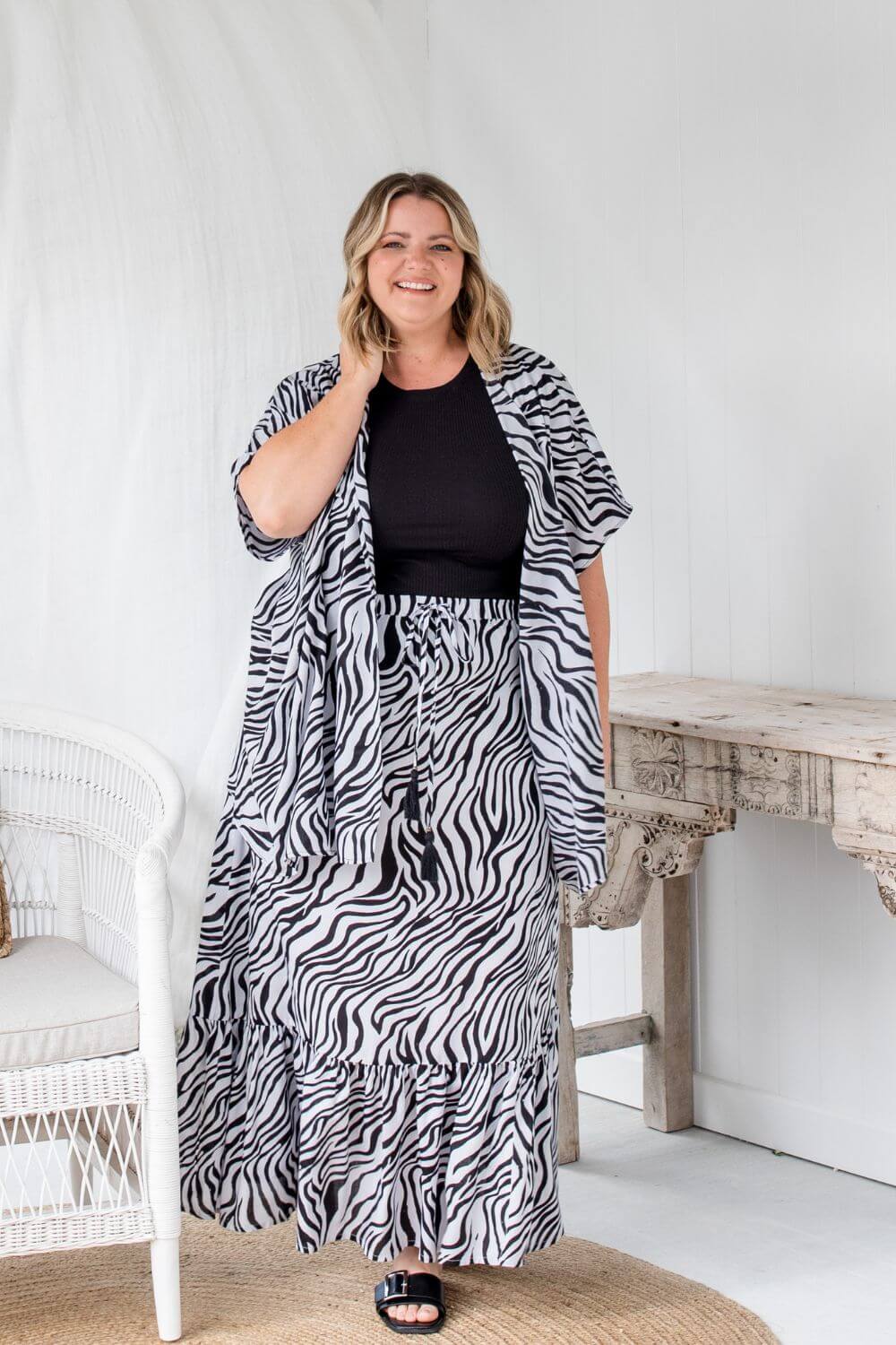 • Long Skirt: Complementing the kimono, our Long Skirt in Zebra print is a true statement piece. The a-line cut and layered design offer both comfort and high-fashion appeal. The elasticised waist and functional drawstring ensure a perfect, dream-like fit. The unique combination of black and soft grey in the zebra print creates an eye-catching look that’s sure to turn heads.
