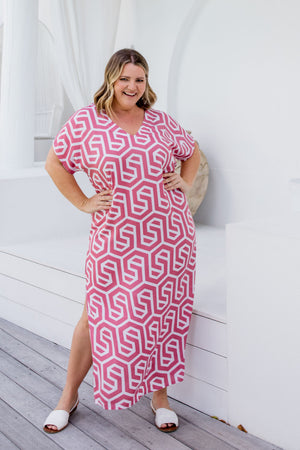 Immerse yourself in the perfect blend of style and comfort with our Dusty Rose & White Geometric Long Kaftan Dress. Adeline has been inspired by the coastal hues and relaxed vibes of the Gold Coast, this piece is a true testament to effortless elegance.