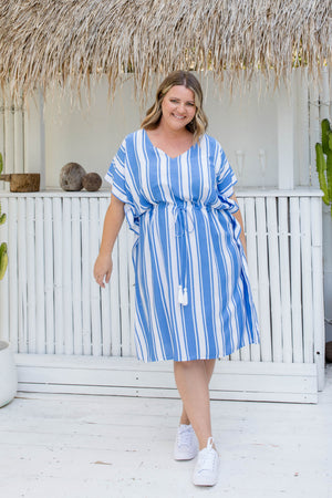 Step into the essence of summer with our Blue & White Striped Short Kaftan Dress, a quintessential piece for those sun-drenched days and balmy evenings.